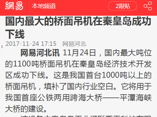 海内最大的桥面吊机在秦皇岛乐成下线http://video.sina.cn/news/2017-11-25/detail-ifypceiq1718350.d.html?from=wap